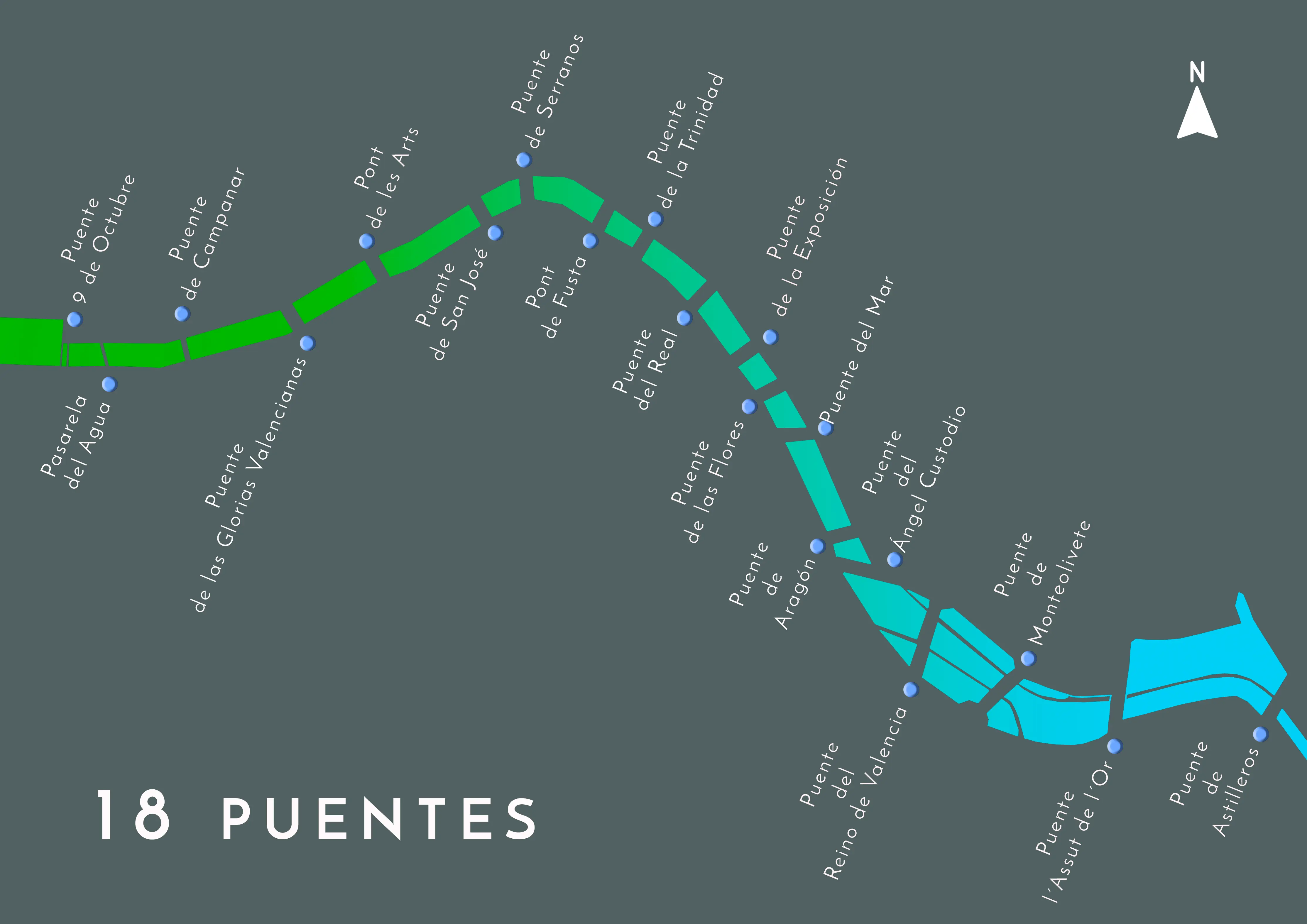 18 Puentes del antiguo cauce del Turia, desde el Parque de Cabecera hasta la desembocadura al mar Mediterráneo.